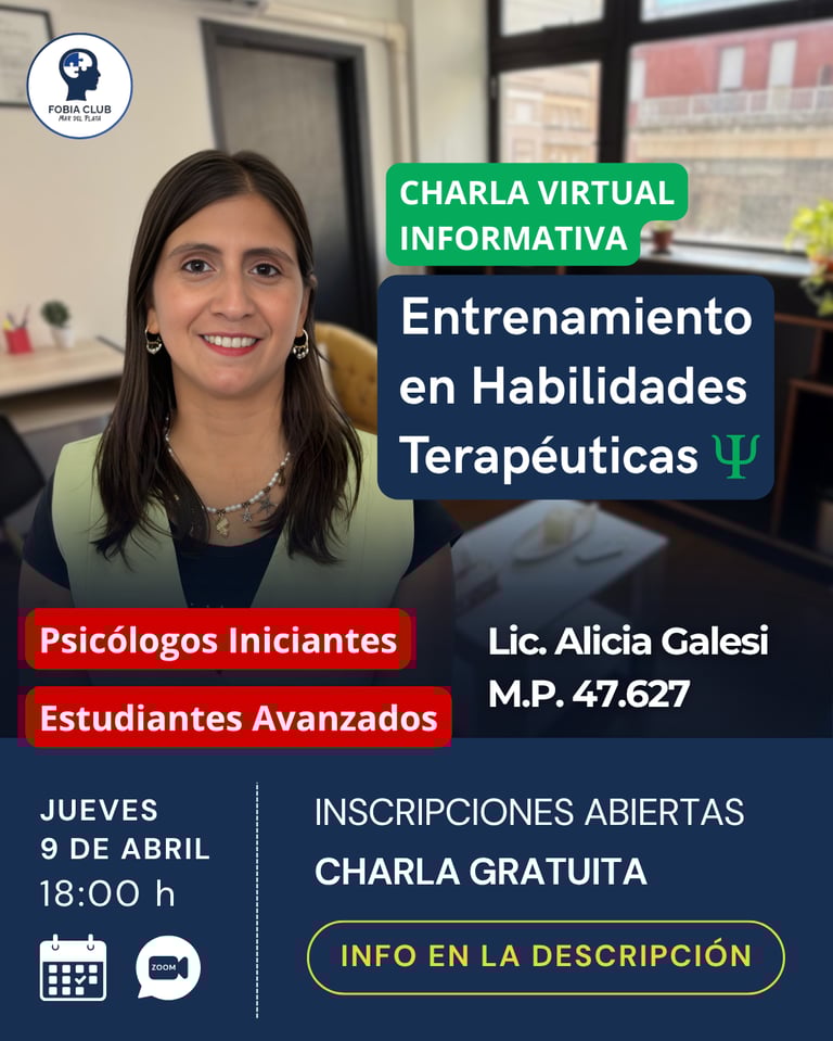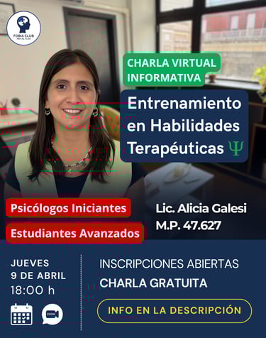 Sabemos que dar los primeros pasos en la práctica clínica o pasar de la teoría a la acción puede generar dudas. Por eso, los invitamos a una nueva Charla Informativa Virtual y GRATUITA sobre Entrenamiento en Habilidades Terapéuticas